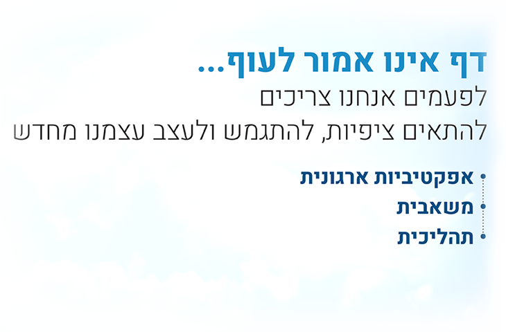 בתום תהליך האבחון והלמידה נייצר תוכנית עבודה ישימה ופרקטית אשר תהווה את אחד המנופים לאפקטיביות וצמיחה ארגונית.